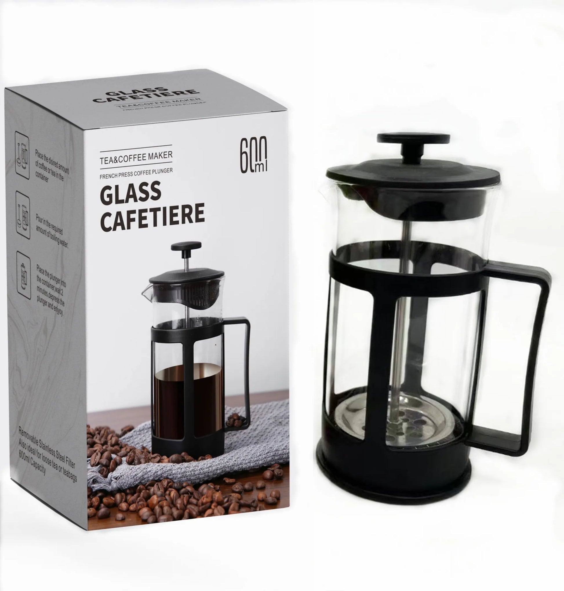 - Material: High-quality stainless steel body with a glass beaker